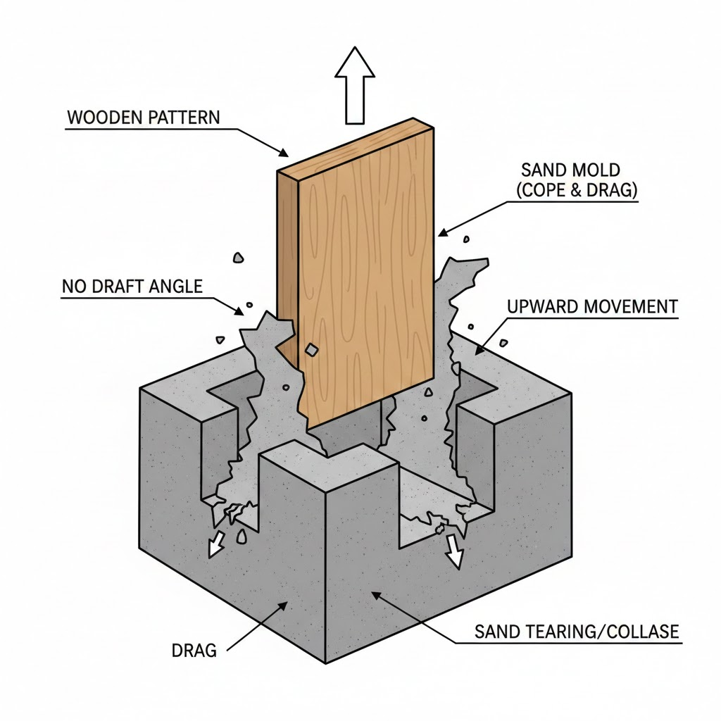 Draft angles are non-negotiable in sand casting. Without adequate taper on vertical walls, the pattern tears the sand mold during removal, destroying the cavity. The draft angle rule of thumb is 2 degrees for external surfaces, but actual requirements depend on feature height and whether the surface is internal or external.