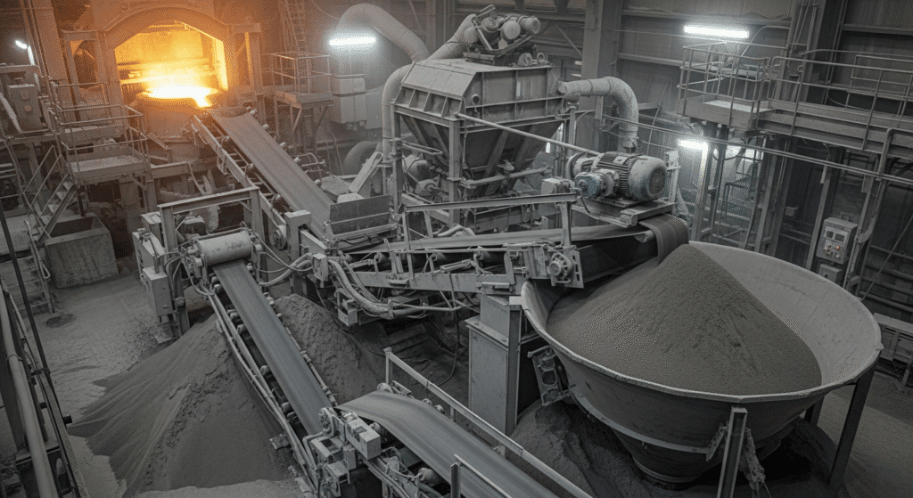 The lifecycle of foundry sand follows three distinct stages. First, virgin sand arrives at the foundry mixed with binders like bentonite clay or chemical resins to create molds for metal casting. After the molten metal cools and the casting is removed (a process called shake-out), the sand is now considered “used sand” contaminated with burnt binder residue, metal particles, and heat damage.